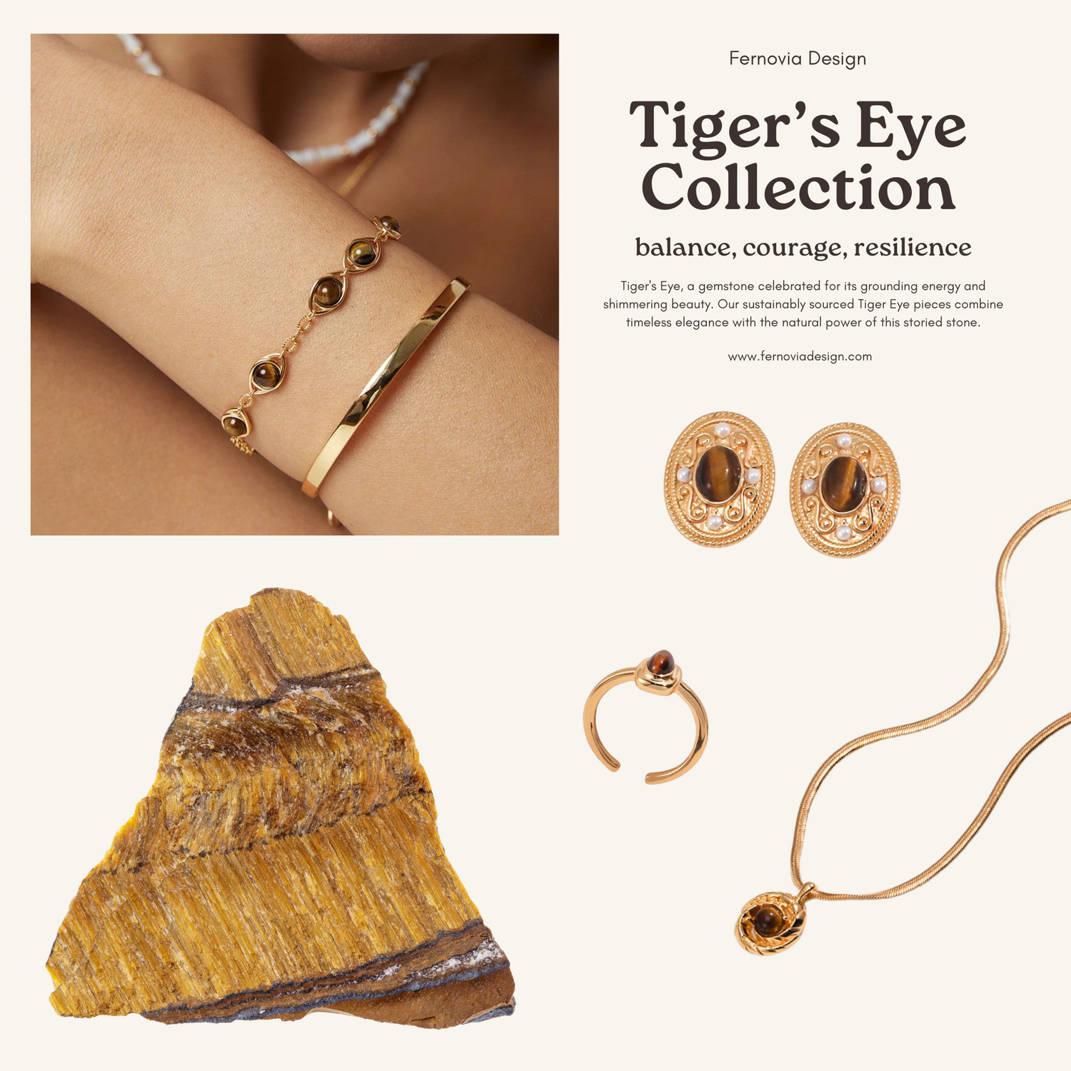 Tiger's Eye, a gemstone celebrated for its grounding energy and shimmering beauty. Our sustainably sourced Tiger Eye pieces combine timeless elegance with the natural power of this storied stone.