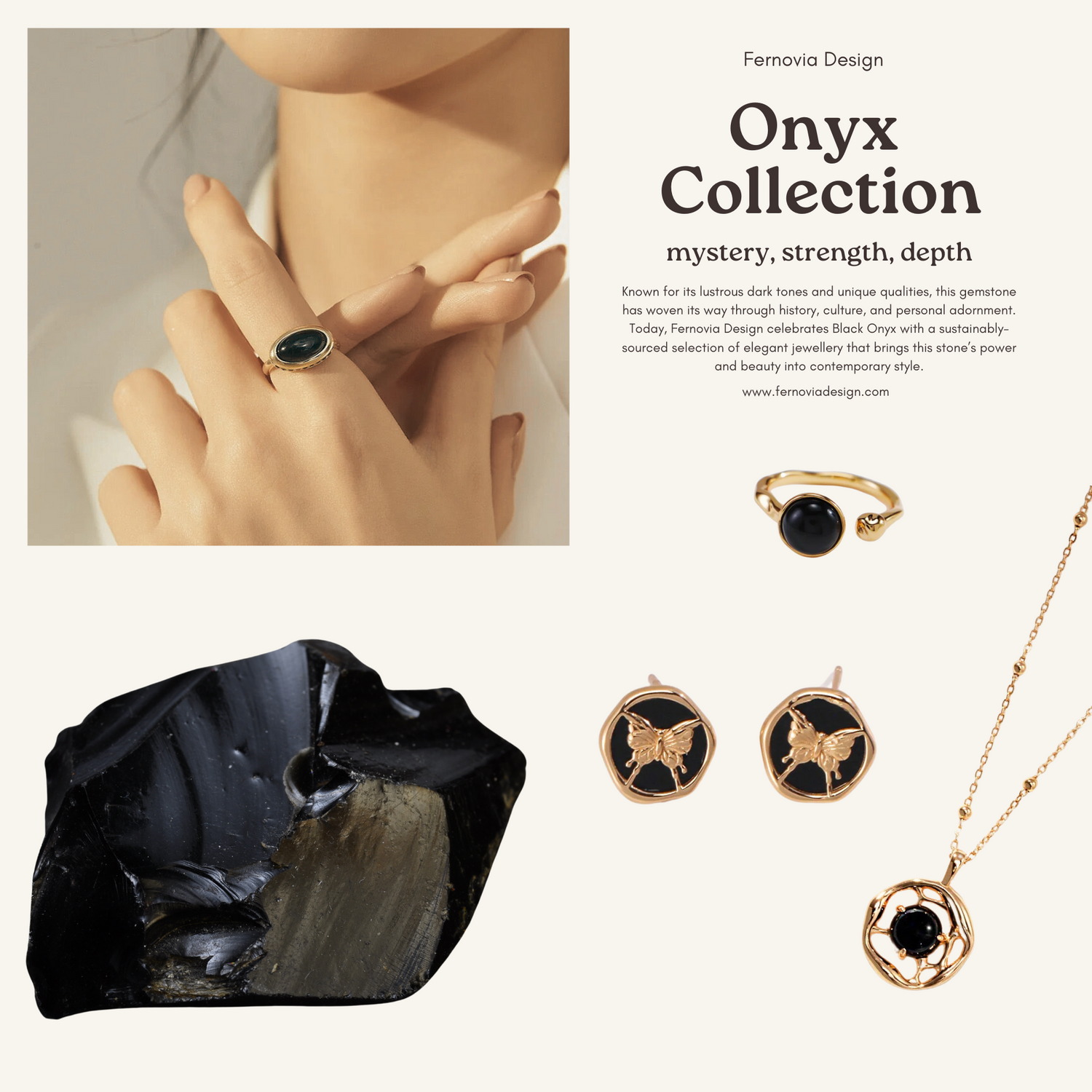 Black Onyx, a gemstone symbolising strength and elegance with roots in ancient culture. Our sustainably-sourced Black Onyx pieces honour this stone’s rich legacy, offering modern sophistication with ethical craftsmanship.