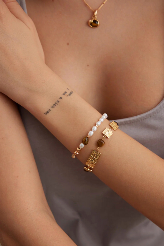 Tiger's Eye, a gemstone celebrated for its grounding energy and shimmering beauty. Our sustainably sourced Tiger Eye pieces combine timeless elegance with the natural power of this storied stone.